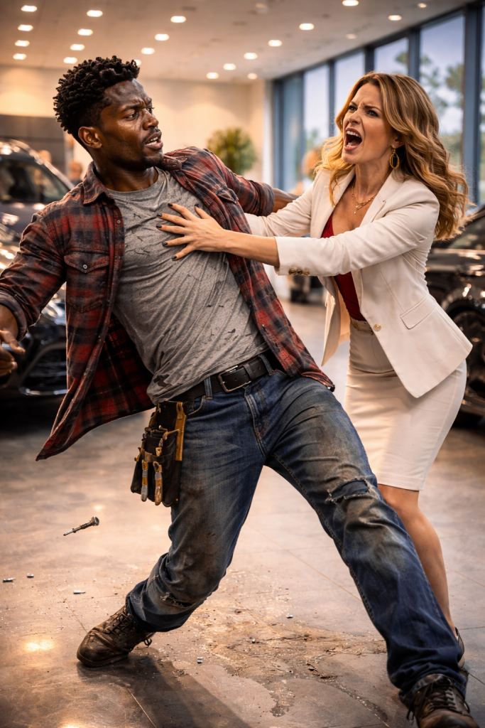 For a long, painful moment, the air inside the luxury dealership went completely still. The soft jazz playing from the hidden ceiling speakers felt strangely out of place against the suffocating tension tightening around my chest. I stood there—a young Black man in a faded, burn-scarred flannel and grease-stained jeans—frozen on the immaculate white marble floor. I could feel every eye in the room shifting toward me. The wealthy couple sitting in the $200,000 sports car nearby had stopped speaking entirely. The man, dressed in a pristine cashmere sweater draped over his shoulders, paused with his overpriced latte halfway to his lips. His wife, glittering with heavy diamonds under the harsh showroom lights, let out a quiet, dismissive scoff that hit harder than any blow.