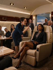 The first class cabin goes silent except for the hum of the air conditioning. Several passengers lift their phones, sensing they are witnessing something that matters.