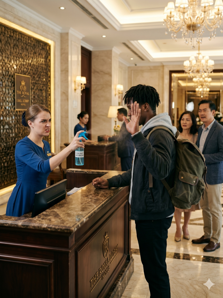 I approached the front desk to check in. I hadn’t even said a word yet. The front desk manager, a woman named Rebecca Miller, looked at me once and grabbed a bottle of hand sanitizer from her counter. Without any warning, she sprayed the strong disinfectant directly into my face.