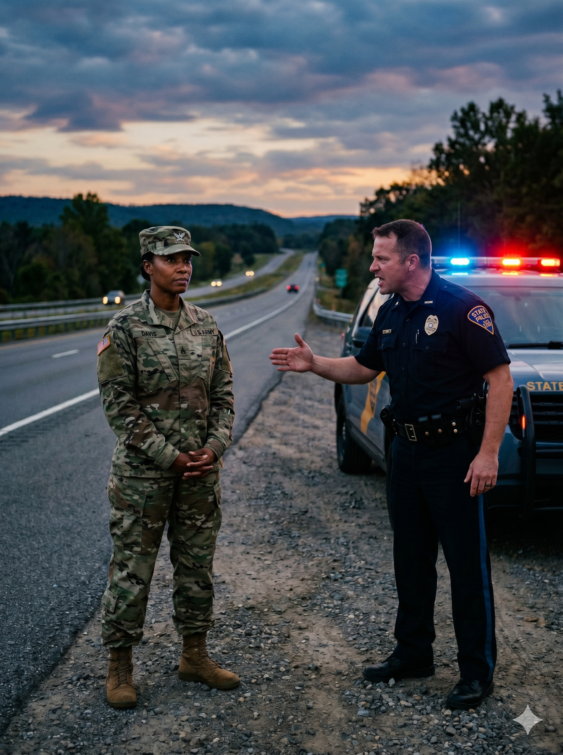 Daniels slammed his door, gripping the steering wheel so tightly his knuckles whitened. He hit the gas, the tires screeching as they pulled away from the roadside. Angela settled in, her gaze forward, her voice calm. Drive safe, officer. Daniels clenched his teeth so hard he swore he tasted blood. The drive to the station was silent.