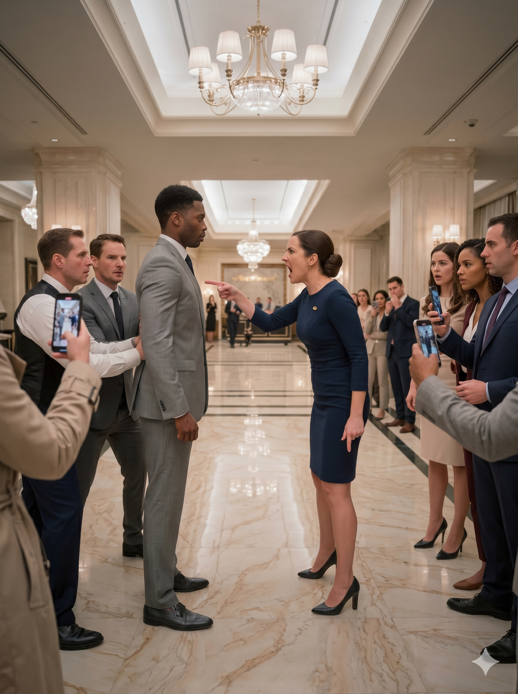 He’s probably planning to rob everyone. Derek studied Marcus’s pressed suit, expensive watch, calm demeanor, then Patricia’s flushed face, and the wall of recording phones. “Ma’am,” Derek said carefully. “Maybe we should handle this privately.” “No,” Patricia’s voice cracked against the marble walls. “I won’t let political correctness stop me from protecting this hotel.