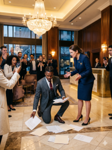 Get on your knees where you belong, boy. Patricia’s polished hand cracked across Marcus’s face with brutal accuracy. His leather portfolio burst open, sending his MIT doctorate sliding across the marble floor like garbage. The Grand Metropolitan Hotel lobby fell into a chilling silence. 50 witnesses, 20 phones already recording. Front-line manager training.