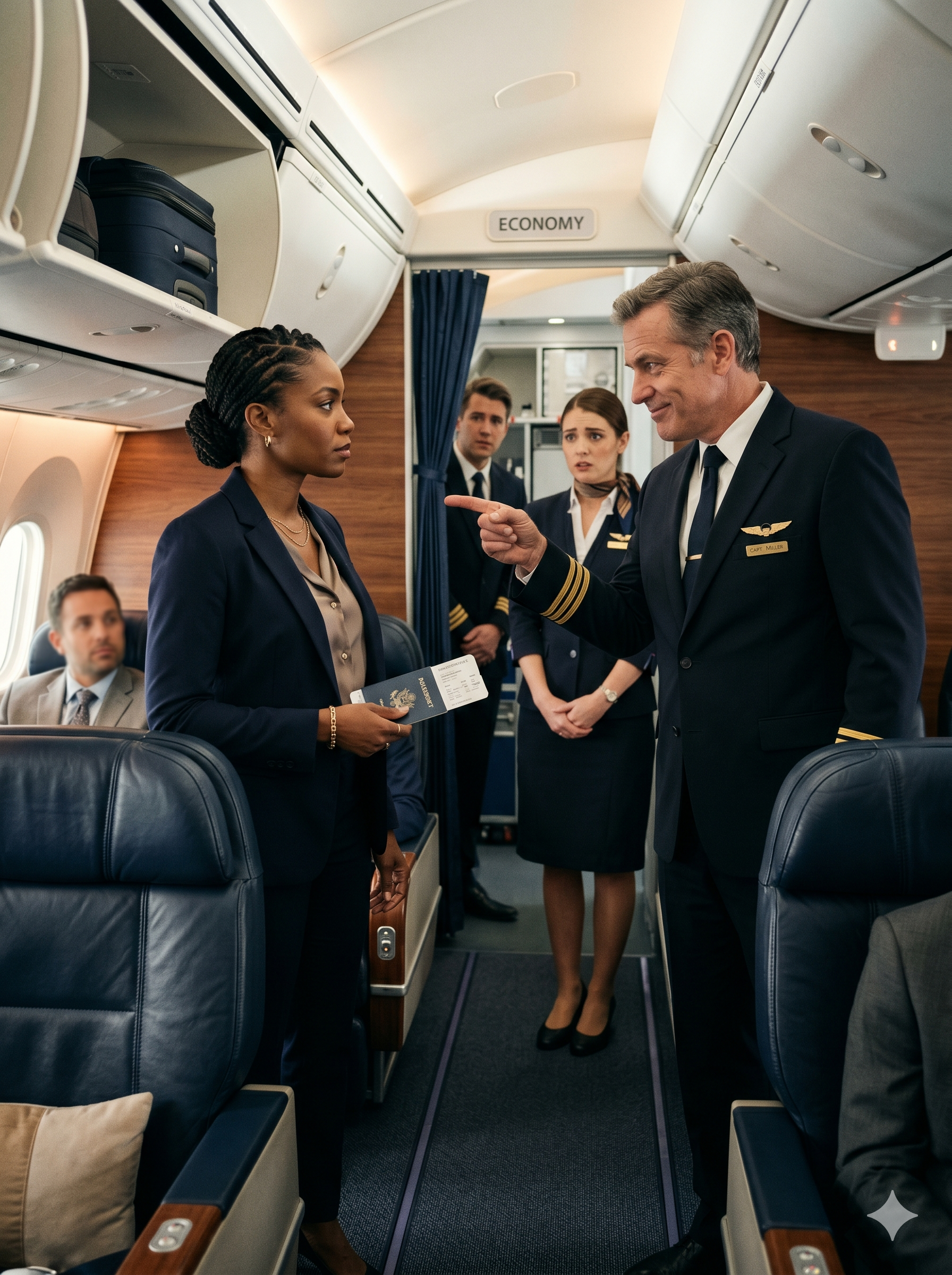 “Well, well, look who thinks she belongs in first class.” >> “I have a confirmed seat. 3A.” >> “Sweetheart, I don’t care what your little ticket says.” >> “People like you sit in the back. Move.” >> “Now, before I have you removed,” >> “I’d like your full name.” >> “Don’t. and your employee ID number.” >> The pilot’s smile twisted into something sour.