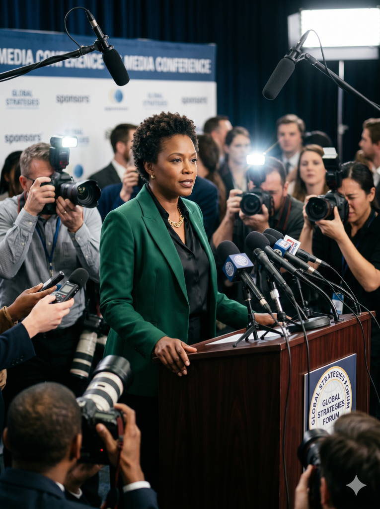 Victoria stood at a podium in the Meridian corporate office.