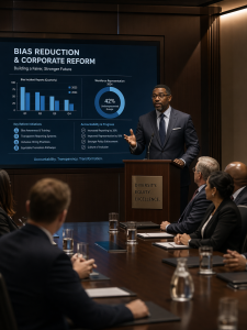 “Executive compensation is now tied to diversity metrics. Stock options contingent on discrimination resolution. Performance reviews include bias prevention scores.”