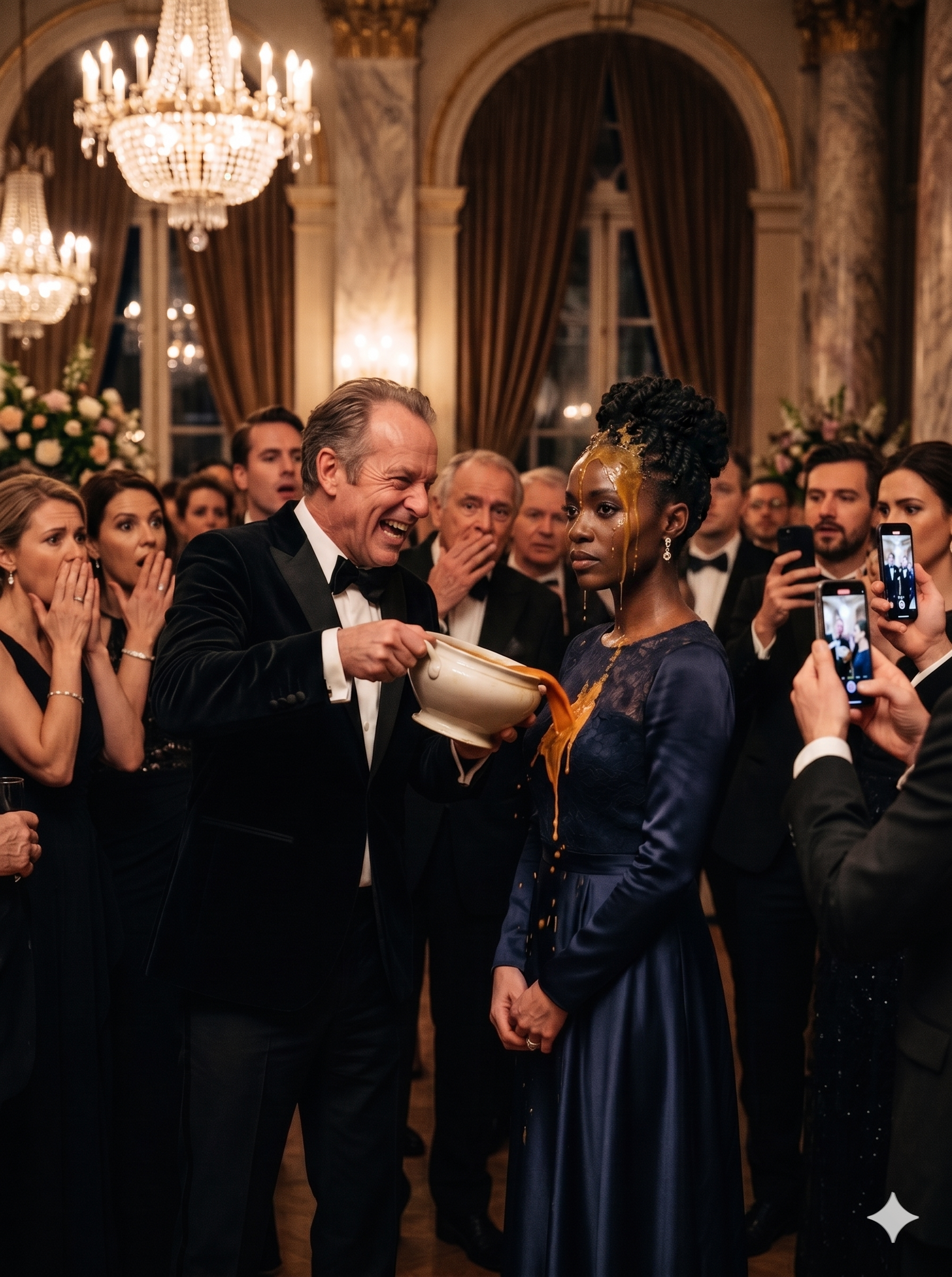 Her navy dress clung to her skin, soup still dripping onto the marble in slow orange drops, yet her posture never wavered.